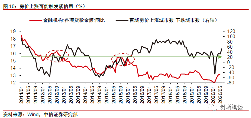 政策关注宽信用外溢到地产等领域,后续信用扩张或迎拐点。宽信用的资金流出实体经济,一方面是房地产市场的逐步火热,另一方面是股票快牛预期逐渐火热。疫情期间,超额的信贷投放使居民存款大量积累。随着疫情得到稳妥控制后楼市的开放,以一线城市为代表的部分热点城市房价在最近几个月出现了比较大的环比增幅,一线城市带动二三线城市房地产市场转热,房价整体有提速上涨的征兆。在“房住不炒”的政策框架下,房价快速上涨必然会迎来调控。政策思路已然明确,地产调控最直接的影响可能还是抵押贷款和居民信用的边际减少,信贷和社融增速也会因此受到一定的影响。
