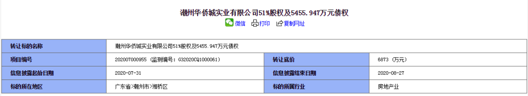 无独有偶,7月31日,据重庆联合产权交易所消息,华侨城拟转让潮州华侨城实业51%股权及5455.947万元债权,转让底价6873万元,其中51%股权转让底价为1417.053万元。据介绍,潮州华侨城实业主要从事房地产投资、开发等业务。