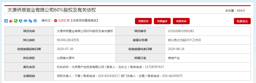 7月30日,据北京产权交易所披露,华侨城(天津)投资有限公司(简称“华侨城(天津)”)拟出让太原侨辰置业有限公司(简称“太原侨辰”)60%股权及有关债权,转让底价9.6亿元,其中60%股权对应挂牌价1.6亿元,债权挂牌价8.03亿元。