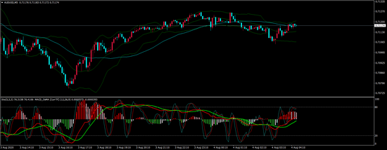 5M:昨日失守0.7130一线偏空,至收盘跌势略有缓和,目前震荡指标高位死叉向下,日内上方关注4H前阻力,短线逢高做空。
