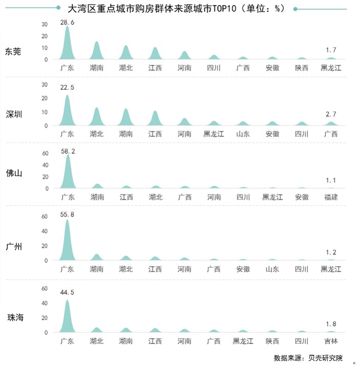 此次发布的报告也显示,凭借较强的经济发展活力和宽松的落户政策,粤港澳大湾区正吸引着全国各地的人前来置业定居。贝壳研究院数据显示,湖南、湖北、江西、河南正成为粤港澳大湾区重点城市新定居居民的输送大省,其中深圳购房客群中来自这四个省份的客户占比为41.6%,在东莞购房客户中占比45.1%。