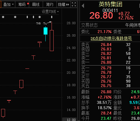 早盘英特集团跌停开盘,9:53分左右,随着超5万手大单的急速涌入,公司股价迅速打开跌停板并一路上攻翻红,最高上涨近7%,最终午间收涨2.76%,早盘振幅高达18.29%,换手率超18.57%,近一个半交易日内换手率接近50%。