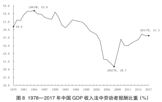 图 8 是 1978—2017 年期间中国 GDP 收入法中劳动者报酬比重的数据图。可以看到,中国劳动者报酬比重自 1984 年起开始明显下降,即从 1984 年的 53.8%,下降到 2007 年的 39.7%,下降约 14.1 个百分点,下降幅度是很大的。虽然 2007 年之后出现回升,但是回升的水平非常有限。到 2017 年,中国劳动者报酬比重约为 47.5%,比 1984 年仍低约 6.3 个百分点。