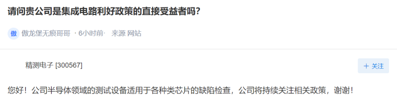 精测电子表示,公司半导体领域的测试设备适用于各种类芯片的缺陷检查,公司将持续关注相关政策。