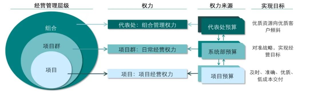 以项目为中心的项目也不只是指一个个的具体项目,而是包含组合、项目群和项目三个层次的完整的项目管理体系。代表处、系统部和项目组应该分别对项目组合、项目群和项目负责。当然一些小的代表处,层级可能没有这么清晰,但这种分层的管理方法依然是适用的。