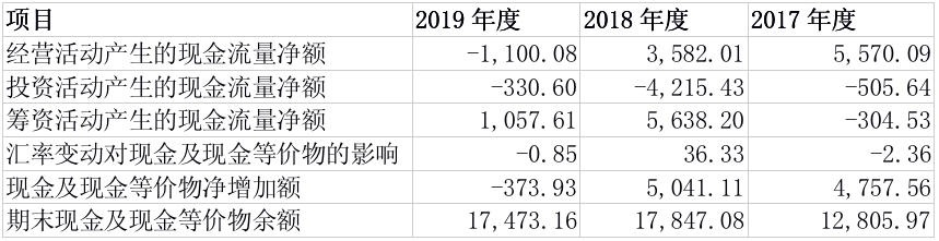 查阅该公司现金流数据,《投资时报》研究员注意到,进入2019年,其经营活动净现金流呈净流出状态,为-1100.08万元,现金及现金等价物净增加额同样为负值,达-373.93万元。而报告期内,该公司投资活动产生的现金流量净额持续为负,整体导致其2019年现金及现金等价物余额为1.75亿元,较上年同期的1.78亿元有所下滑。