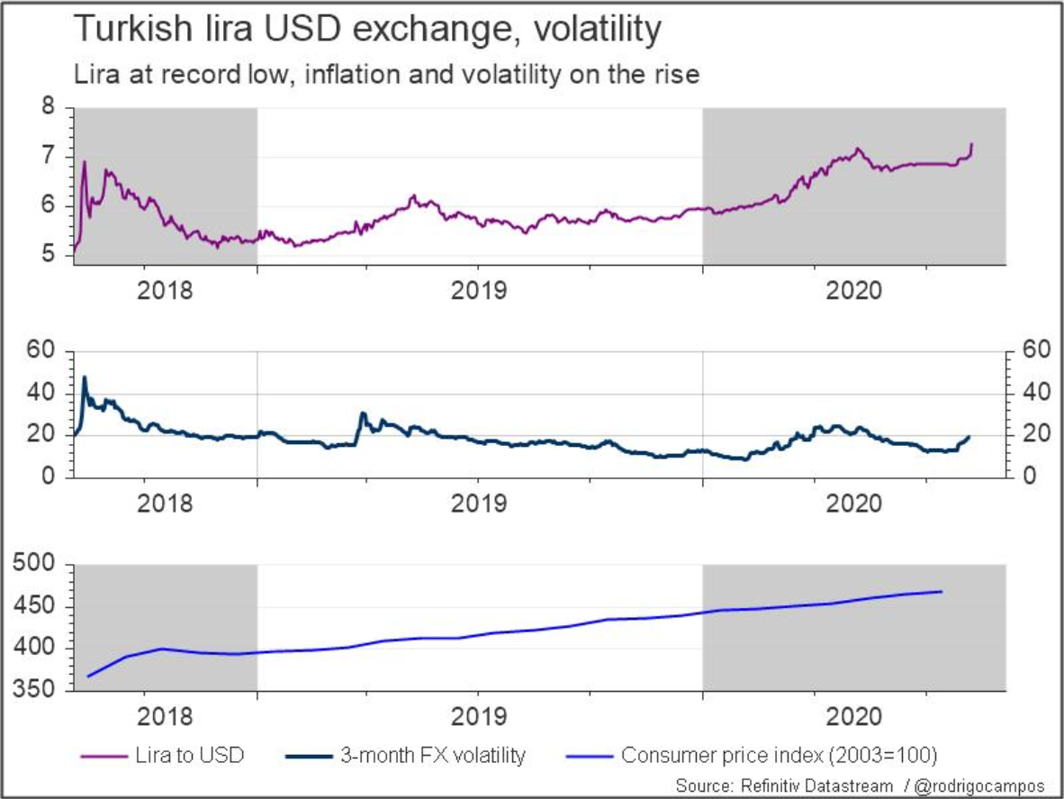 里拉再度承压,也引发了对于土耳其偿还外债长期能力的担忧,其外债中包括对欧洲的银行。里拉走软还使得进口商品更加昂贵,并可能抑制土耳其对欧洲商品的需求,而新冠疫情已经令欧洲的贸易和产出受到冲击。