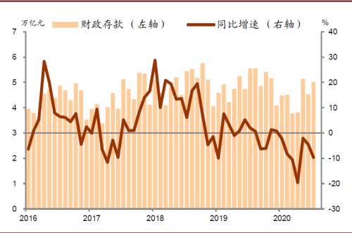 财政存款增速下降。7月财政存款增量(4872亿元)低于去年同期(8091亿元),财政存款同比增速从6月-4.5%降至7月-9.7%。近期财政赤字同比扩张下滑主要受政府发债减慢制约。