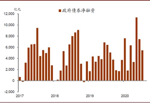政府融资进一步减少。政府债券净融资5459亿元,较6月7450亿元下降。政府债券净融资连续两个月回落。