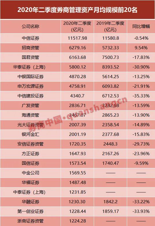 中国基金业协会于10日公布了《2020年二季度资管业务相关数据》,其中包括了券商资管的主动管理资产月均规模以及券商资管月均规模,从中可以透视出排名前列的券商资管去通道化的阶段性成果。