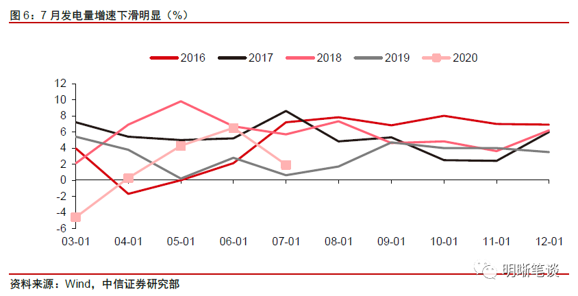 工业增加值增速持平,需求端持续偏弱或阻碍生产继续快速回升。7月工业增加值同比增速为4.8%,与上月持平,这与7月PMI生产指标基本与上月持平较为一致。二季度以来,投资需求是支撑经济修复的最大动力,7月地产投资增速依然强势上行而基建投资增长不及预期,加上水灾影响,可能是工业增加值表现差强人意的重要原因。而投资需求的演绎基本走向极致,消费需求的回升缓慢可能是制约生产端继续快速修复的主要因素。正如前文所述,消费需求的回升仍然缓慢,那么可能继续制约生产端的修复。6月份以来我们提示的需求修复慢可能逐步反馈到生产端(《债市启明系列20200629—七月债市展望》)的逻辑可能会逐步演绎。