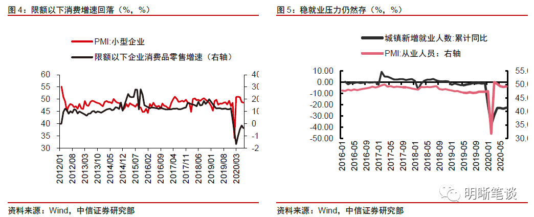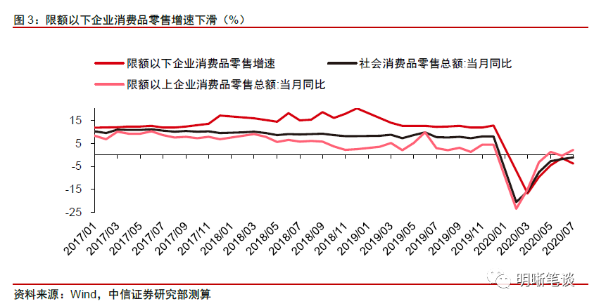 关注限额以下消费拖累,背后或是收入和就业问题。即便政策推动汽车消费大幅回升,但7月社会消费品零售总额(-1.1%,+0.7pct)当月同比增速仍未转正,其中限额以上零售总额当月同比增速(2.2%,+1.8pcts)回暖,但限额以下零售(-3.7%,-2.3pcts)增速放缓大幅拖累总体增速。从历史数据看,限额以下消费品零售总额增速历史上绝大多数时间都高于限额以上消费品零售增速,但今年3月份以来限额以下消费增速修复速度明显低于限额以上消费品零售增速,这与疫情防控措施下小型企业消费场景恢复慢、人们倾向于在大企业消费场景进行消费有关;另一方面,低收入人群面临更大的就业压力,与之对应的小额消费场景恢复较慢。限额以下消费与收入和就业关系较大,这可能是导致消费持续弱势回升的主要原因。