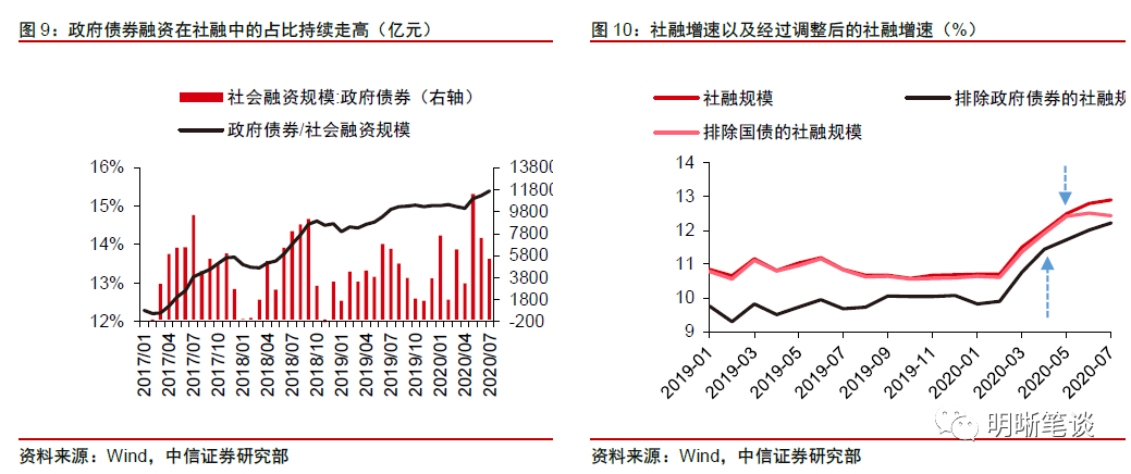 慢变量二:信用宽松放缓。7月社融增速显示实体融资需求扩张放缓;信贷投放不及预期或由于监管政策下的供给收缩。二季度货政报告中明确要求促进贷款投放与市场主体实际资金需求相匹配,使资金平稳有序地投向实体经济,支持经济增长向潜在增速回归,不需要大幅宽信用来支撑经济增速反弹。正如7月信贷数据显示了政策对信贷供给的影响,因而从这个角度看,前期超宽松的货币政策推出后,宽信用步伐也将放缓。实际上,扣除国债的社融增速已经有所放缓。