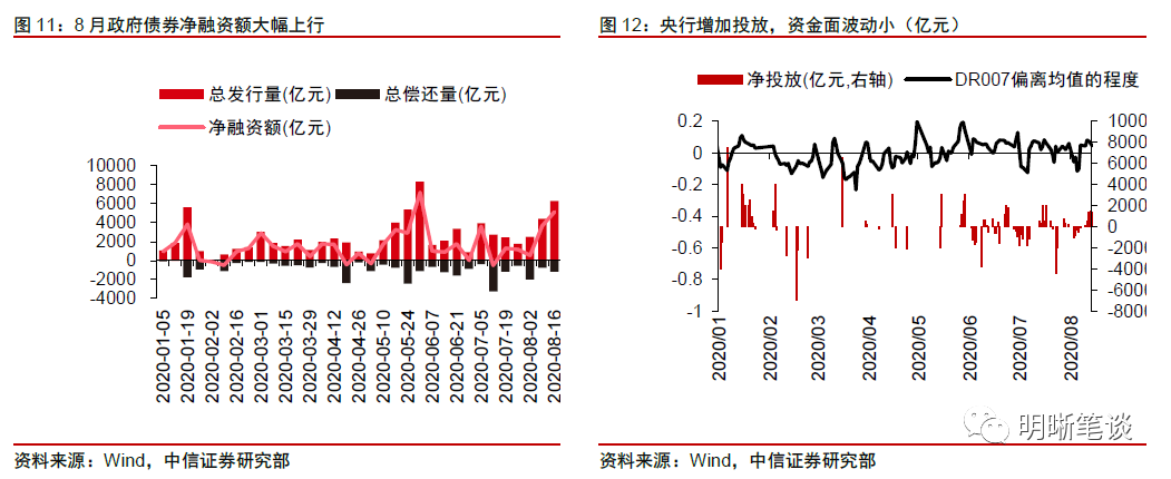 8月份以来政府债券发行量大增,一度成为债市的利空因素。8月份之前市场就政府债券发行压力做了较多讨论,也形成了债券供应压力较大的一致预期,成为利率的利空因素。8月以来政府债券发行确实有所提速,8月第一周国债+地方债净融资额3641.81亿元,第二周国债+地方债净融资额5155.04亿元,为年内仅低于5月最后一周的次高的单周净融资额。