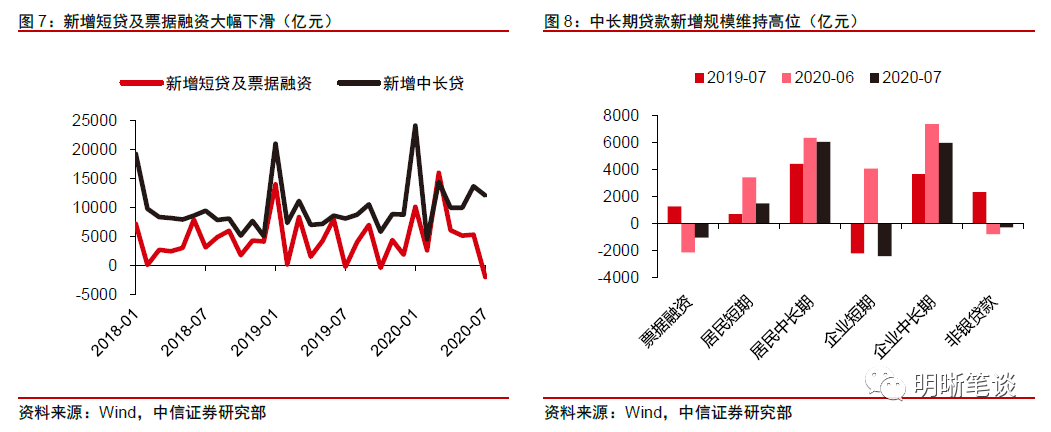 7月信贷投放不及预期或由于监管政策下的供给收缩。从新增贷款的结构上看,中长贷增长较多而短贷增长连续减速。当前短期与中长期信贷增长的分化可能提示我们信用供给侧出现了一些收缩,而社会融资需求(可能来自较低的信贷成本以及财政高融资带来的基建需求)依旧维持一定水平。从商业银行的视角来看,由于监管层对结构性存款以及票据贴现等可能涉及“资金空转套利”的业务监管从严,因此短期信贷供给自然有所下降;同时政策层“增加制造业中长期融资”的要求也会使得商业银行在有限的信贷额度内更倾向投放中长期信贷。
