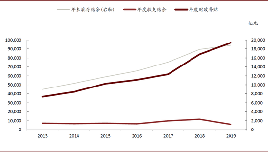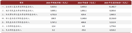 图表: 全国社会保险基金收到的补贴及结余情况(2019年度)