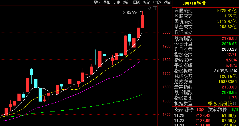 今年以来,国内玉米价格持续攀升,近期更是在洪灾干扰下有加速上扬的趋势,并带动小麦、稻谷的价格上涨。这导致农业股反复走强,今日早盘种业板块再次逆市大涨,截至午间收盘,板块指数强势拉升4.42%,再创历史新高,今年以来该指数累计上涨逾115%。