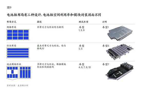动力总成。此次对标分析揭示出各种各样的动力总成设计理念,包括电池布局、热管理设计与布线,以及动力系统模块集成。我们的3-D模型显示一半的车型使用了网格和行状的电池组布局,这增加了空间利用率,同时,这种布局相比多尺寸电池模组,减少了封装变化,可降低模组生产成本(图9)。