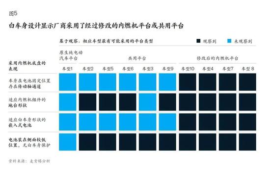 为快速提供多种纯电动汽车产品和车型,中国多数纯电动汽车厂商均通过调整现有内燃机平台或使用多用途通用平台来制造汽车。在物理拆解过程中,我们也利用3D数字孪生/虚拟现实软件比较了这些车型的设计。这项工作让我们看到,10款纯电动汽车中,9款在电池形状、电池位置以及地板形状等方面具备相似特征。由此可见,这些车型都使用了过去的内燃机底盘,也就是说,它们采用的是经过修改或可共用的内燃机平台(图5)。同样,采用相似设计有助于推进产业化,因为现有工艺和制造技术蓝图都能派上用场。在产品开发流程中,产业化占了相当大的比重,这种方式对于缩短产品上市周期至关重要。