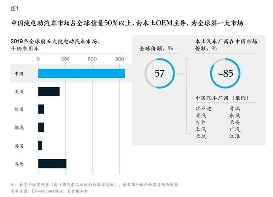 中国汽车市场是全球汽车业最大的利润池,贡献了全球总利润的1/3(约400亿美元)。如今,这个市场正转向电动出行。2014-2019年间,纯电动汽车在中国的销量每年增长80%。2019年中国的纯电动汽车销量超过了90万辆,全球售出的纯电动汽车当中,有57%是在中国市场售出的,使中国当仁不让成为全球最大的纯电动汽车市场。而从OEM市场份额来看,中国厂商几乎完全垄断了这个市场。2019年,国际汽车厂商在纯电动汽车市场年销售量中仅占15%的份额(图1)。