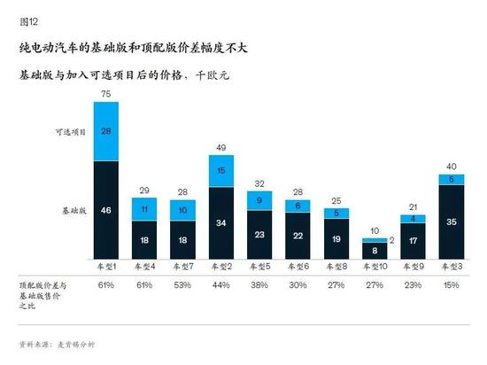 这10款车型中的7款从基础版到顶配版的价差幅度不超过50%(图12)。10款中有5款提供方案以外的电池或发动机升级,有三款提供更昂贵的车身选择,比如颜色和轮毂。由此来看,在定价策略或非硬件收入方面(例如无线软件更新)似乎存在着有待挖掘的收入潜能。总之,国际汽车厂商可将我们的研究发现视为简化产品组合或寻求差异化的参考,尤其是当它们考虑进入中国市场时。