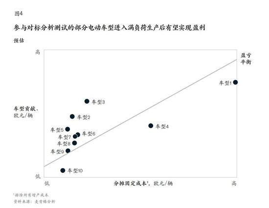 我们基于逾25万个数据点对物料和生产成本进行了估算。结果表明,10个车型中有9个都能达到中等或以上水平的边际贡献率,最高可达50%。不过,当我们将保修、营销成本、一般性成本及管理费用、研发、资本支出纳入考量之后,我们估计营业利润率依然为正的车型将减少(图4)。固定成本的巨大差异可能源自多重因素,比如整合深度、采购策略差异、厂商总产量等。