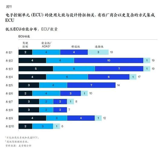 电子电气架构。本次对标测试显示,在具备相似功能的车型之间,低压线束的重量各有不同。这表明在电子电气架构中存在重大的设计和成本优化空间。与此类似,参与此次测试的厂商各自选择了不同的ADAS9功能,采用了不同的电子控制单元(ECU)集成设计,所使用的ECU数量也各不相同。这些车型装配了6~19个分散式ECU(图11)。一个潜在的发展方向是将所有功能集成在单一汽车控制器中,如美国一家纯电动汽车厂商的做法。藉此,厂商或可以相对较低的成本实现性能提升,但这需要大量研发投资,以及先进的内部软件开发能力。
