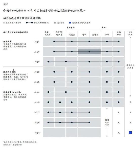 此外,物理集成度也各不相同。只有三个车型显示了较高的集成水平:电子组件和电气驱动系统实现了物理集成,且热管理系统涵盖了所有组件。另有两个车型显示出相同的物理集成水平,但电驱系统和电池部分的热管理系统是分离的。其余车型使用了较少集成组件:单独的电气模块和单独的热管理。其中三个车型使用了被动风冷方式,此类车型相比使用电池水冷技术的车型,充电速度受限(图10)。