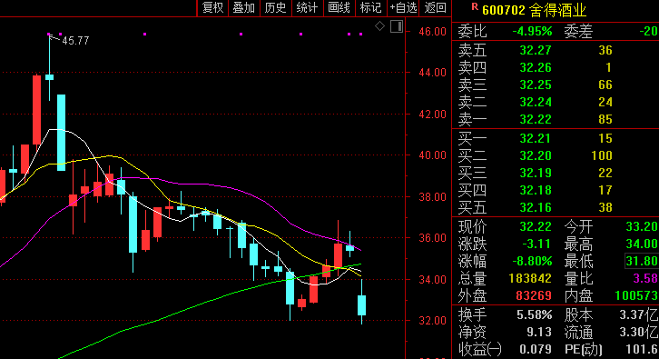 值得注意的是,舍得酒业今日跳空大跌,盘中一度跌停报31.8元,创近2个月新低价,目前跌幅超8%。