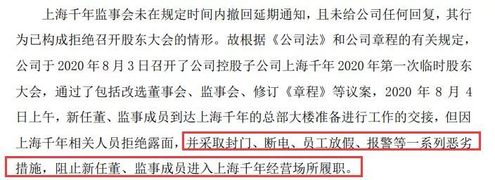 次日上午,新任董、监事成员到达上海千年的总部大楼准备进行工作的交接,但因上海千年相关人员拒绝露面,并采取封门、断电、员工放假、报警等一系列恶劣措施,阻止新任董、监事成员进入上海千年经营场所履职。