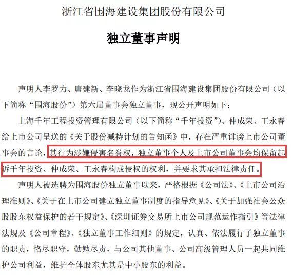 对于上述指控,*ST围海当然拒不接受。公司在公告中表示,《告知函》中所述的“减持原因”与事实严重不符,存在严重诽谤上市公司董事会的言论,其行为涉嫌侵害名誉权。