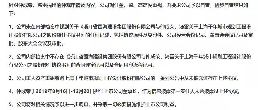 据披露,该仲裁案的仲裁理由为:2017 年仲、汤二人与上市公司签订《协议书》)。公司公告的2017年、2018年、2019年年度报告,及《关于上海千年城市规划工程设计股份有限公司业绩承诺完成情况的鉴证报告》已经证明转让协议约定的业绩达标。