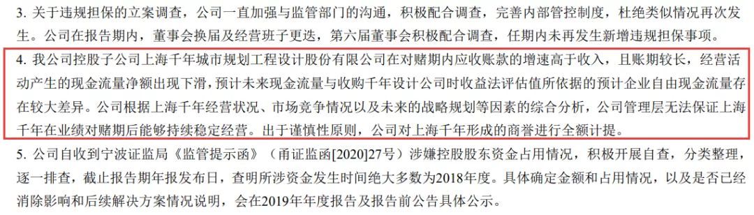 公告显示,目前专项审计报告和减值测试报告均尚未完成,但根据2019年年度财务数据和2020年一季度财务数据,上海千年存在应收账款账期较长、回款较慢的情况,且应收账款占比与同行业可比公司相比存在较大差异等诸多财务疑点,上市公司尚不确定上述盈利补偿、减值测试补偿的相关条款是否触发。
