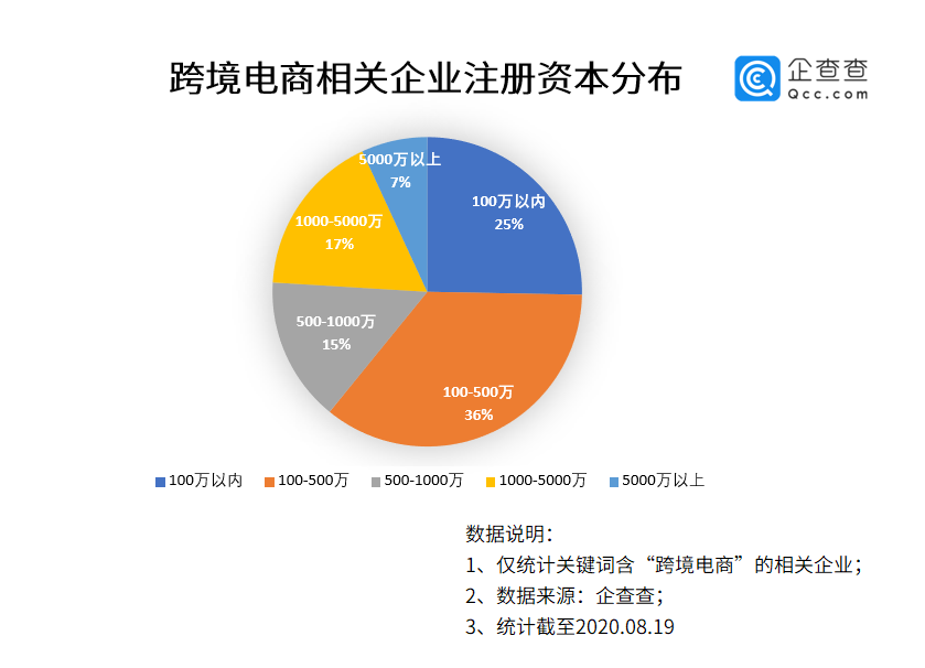 从注册资本方面来看,跨境电商相关企业的分布比较平均。企查查数据显示,共有25%的企业注册资本低于100万,而注册资本在100万-500万之间的企业占比36%,此外有7%的企业注册资本高于5000万。