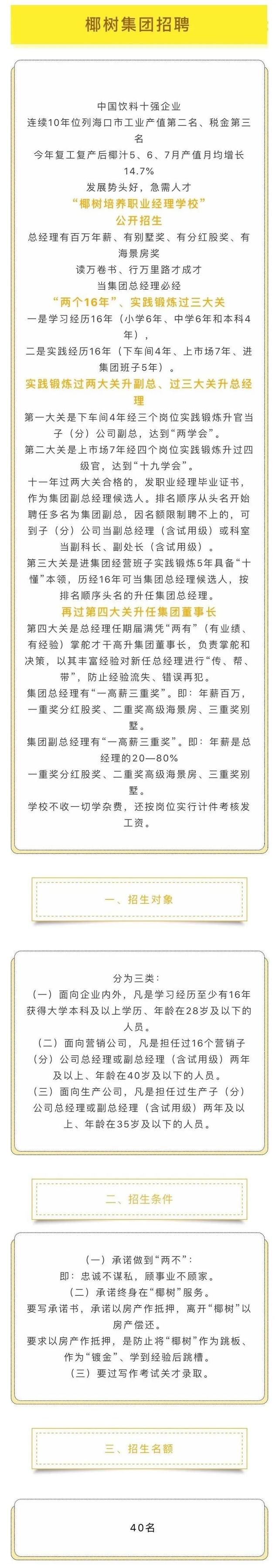 昨日,我集团发布“椰树培养职业经理学校”招聘信息引发网上热议,本次招聘旨在为集团储备高级管理人才,并能与集团长期共同发展,但由于对招聘信息审核不严,用词不当,部分条款已违反劳动合同法相关规定以及人文精神,造成不良影响,我集团在此向社会大众深表歉意。
