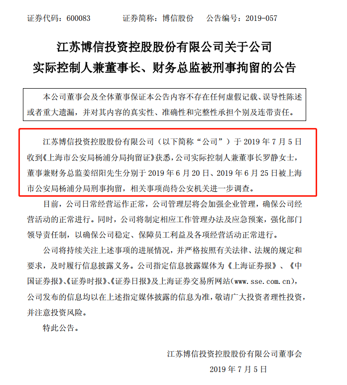 2019年7月5日午间,罗静实际控制的A股上市公司博信股份发布公告称,江苏博信投资控股股份有限公司于2019年7月5日收到《上海市公安局杨浦分局拘留证》获悉,公司实际控制人兼董事长罗静以及董事兼财务总监姜绍阳分别于2019年6月20日、2019年6月25日被上海市公安局杨浦分局刑事拘留。