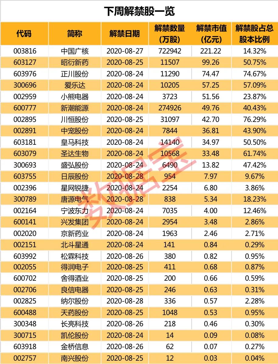 本周5股解禁市值在50亿元以上,分别是小熊电器、爱乐达、正川股份、昭衍新药和中国广核,其中中国广核解禁市值最大,为221.22亿元。