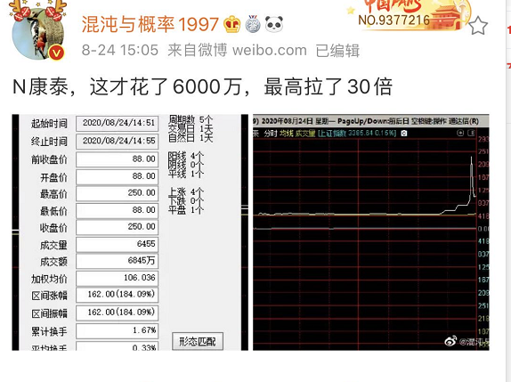 随后,该公司股价在2分钟的时间里恢复正常,涨幅再次回落至1100%左右,整个过程仅有5分钟。