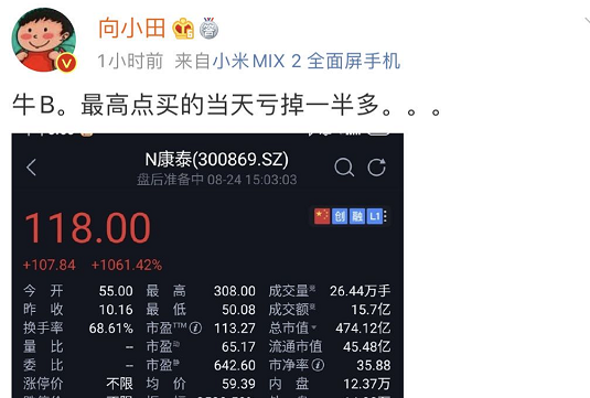 如果在最高点买入300股,到收盘这四分钟就亏了5万块钱。最高点买的当天亏掉一半多。亏损幅度高达60%多