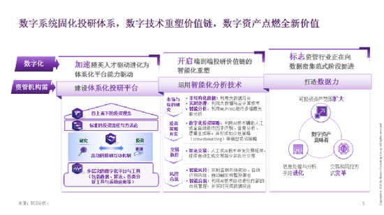 大数据与高级分析技术和区块链技术的发展,推动了数字资产的兴起。数字资产兼具数字属性与资产属性,包括了经技术革新后以数字形式在线上流转的传统资产,和被赋予资产性质的新型资产(如数据)。数字资产丰富了可投资资产范围、进化了信息处理与分析技术、变革了交易和风控方式。这不仅提升了资本市场的广度、深度和效率,更标志着整个资产管理行业的生产要素配置模式正在向最高级阶段,即数据密集范式阶段挺进。