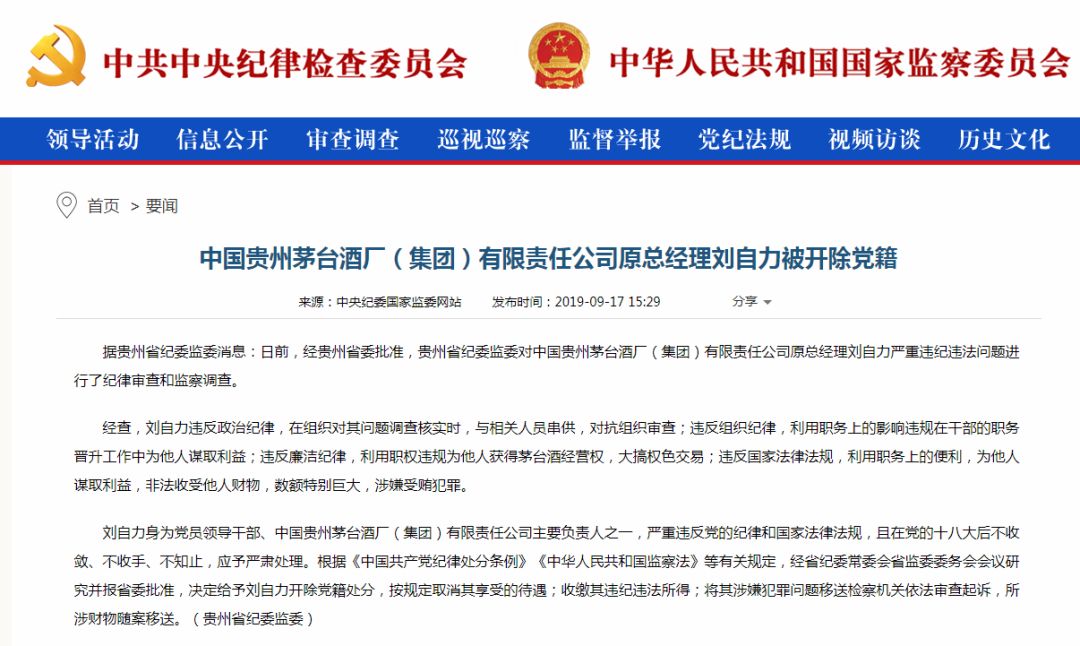 据中共中央纪律检查委员会网站2019年9月17日消息,经贵州省委批准,贵州茅台原总经理刘自力被开除党籍。原因是其违反组织纪律、违反廉洁纪律以及涉嫌巨额受贿犯罪等。