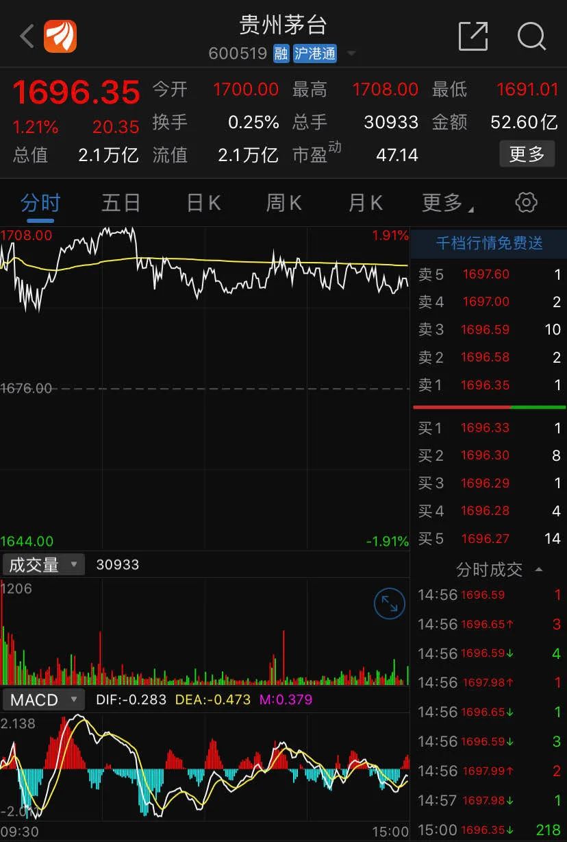 股价方面,贵州茅台今年以来涨势如虹。行情数据显示,截至今日收盘,茅台股价报1696.35元/股,一手价格接近17万,总市值突破2.1万亿元。