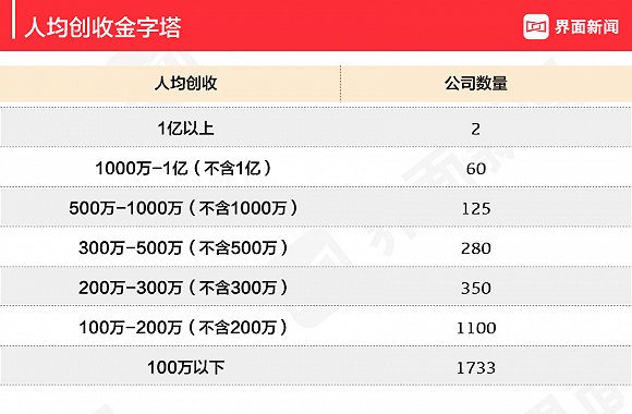 从人均创收的分布来看,呈明显的金字塔分布。人均创收超过1亿元以上的公司仅有2家。其次,大部分企业的人均创收集中在100万-200万和100万以下,分别有1100企业和1733企业,占比超过了77%。