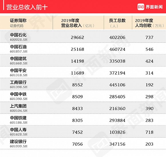 据统计,中国A股上市公司在2019年营业总收入达到了50.18万亿元,其中营业总收入最高的是中国石化,达到了29962亿元,但由于员工总数超过了40万人,因此人均创收仅有737.48万元。