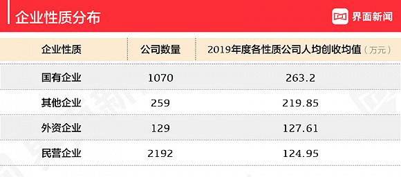 在3560家A股上市公司中,国有企业的人均创收为263.20万元,位列第一;其他企业(包括集体企业、公众企业等)有259家,以人均219.85的创收位于第二。然而外资企业仅比民营企业的人均创收略高一点,分别为127.61万元和124.95万元,但民营企业的公司数量是外资企业的17倍左右。