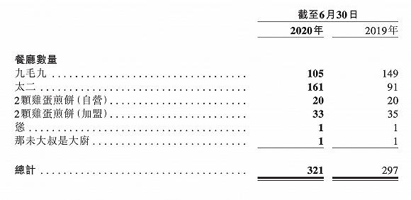 (图片来源:九毛九2020年上半年财报)为减轻疫情对公司业务运营的影响,九毛九称在上半年共关闭了48家自营餐厅(包括43间九毛九餐厅、2间太二餐厅及3间2颗鸡蛋煎饼自营餐厅),并且表示不再在广东省和海南省以外经营九毛九餐厅,关闭餐厅而出售资产产生亏损约达到2780万元。截至目前,九毛九共运营321家餐厅,其中太二数量最多,达到161家。
