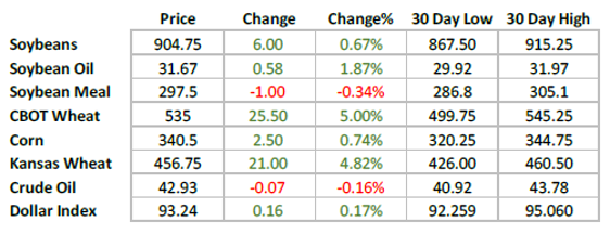 过去一周,油籽复合物价格在区间范围内波动,缺乏与当前市场预期不同的新的基本面消息,对当前产量的威胁很小或基本没有影响。有传言称中国有兴趣购买美国小麦,导致小麦价格上涨。