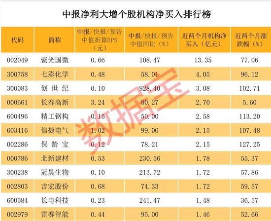 今年上半年净利大幅增长(增幅在五成及以上)的个股中,近两个月以来龙虎榜机构净买入超过亿元的共有14只,其中净买入金额最大的个股有:紫光国微上半年净利润增长108.47%,机构净买入13.35亿元;七彩化学净利润增长58.01%,龙虎榜机构资金净流入4.05亿元;创世纪业绩同比增长928.4%,机构净买入3.08亿元。另外,机构青睐的绩优个股自6月26日至8月25日期间市场表现不俗,保龄宝涨幅达127.25%,跑赢大盘113.62%,精工钢构上涨113.2%,超过大盘99.57%。