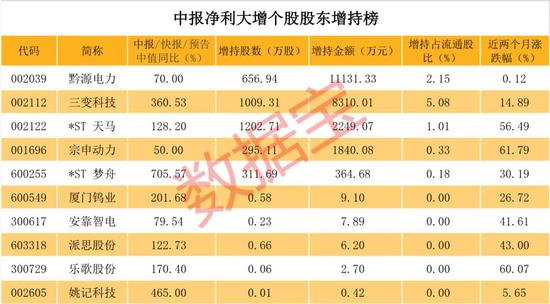 增持股数最多的个股有:*ST天马(维权)上半年净利润增长128.2%,增持1202.71万股;三变科技净利润增长360.53%,股东增持1009.31万股。而增持金额(若未公布增持价格的则按增持当日收盘价计算)最多的黔源电力业绩同比增长70%,增持金额高达1.11亿元,其次三变科技增持0.83亿元。从增持股数占流通A股比例这类相对数更能观察出增持的力度,三变科技增持1009.31万股,占流通A股比例最高,达到5.08%。另外,股东青睐的业绩大增个股自6月26日至8月25日期间市场表现不俗,宗申动力涨幅达61.79%,跑赢大盘48.16%,乐歌股份上涨60.07%,跑赢大盘46.44%。