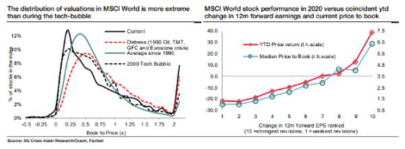 法兴银行量化研究主管拉普索恩(Andrew Lapthorne)指出,这是因为市场对未来收益的广泛预测不同。市场对收益预期改善得越多,回报也就越高,这家公司股票的估值也会变得越高。